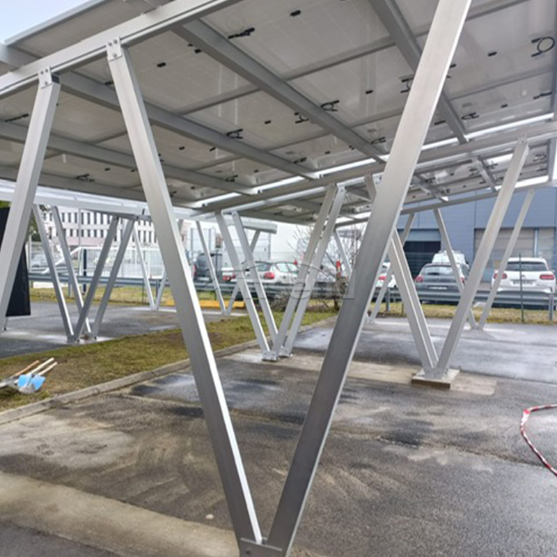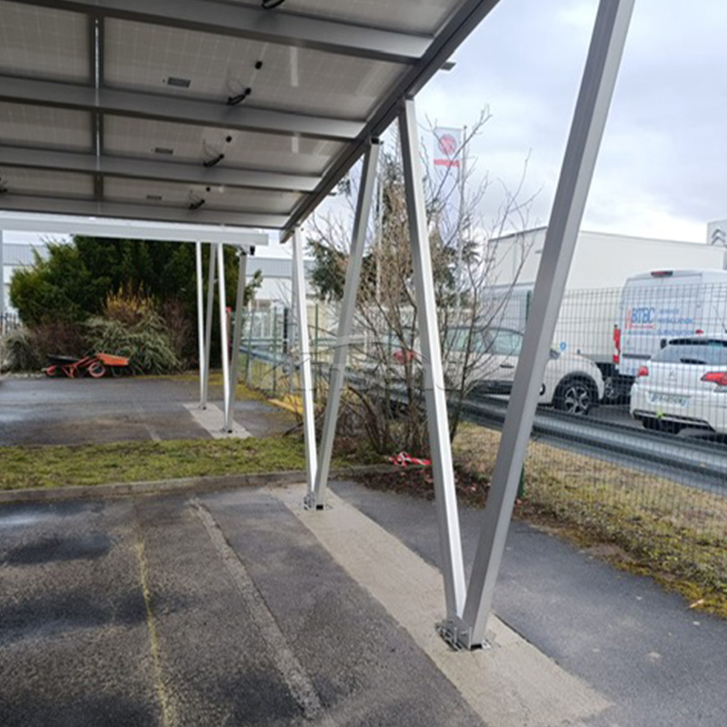 Beschreibung: Das Solar-Carport-System ist mit angemessenen Spannweiten entsprechend den Parkbedürfnissen der Kunden angeordnet, sodass Fahrzeuge bequem ein- und ausfahren können. Es verwendet hohe vormontierte Aluminiumhalterungen für eine schnelle Installation vor Ort