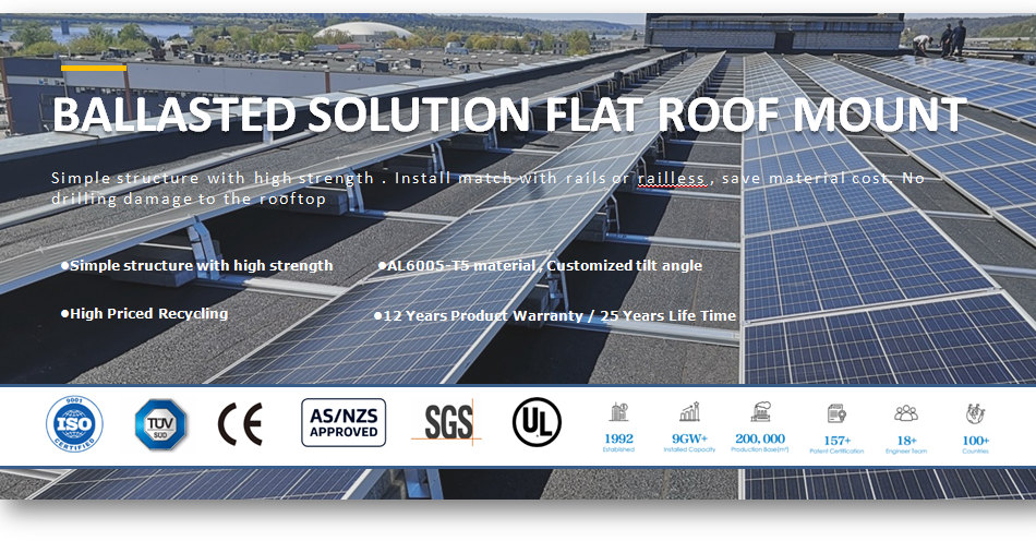 Das Ballaststativ- Flachdachmontagesystem ist relativ einfach und schnell zu installieren, was die Installationszeit und die Arbeitskosten reduzieren kann. Das Ballaststativ-Flachdachmontagesystem ist eine effektive und effiziente Lösung für Flachdach-Solarmodulinstallationen , die Stabilität und Sicherheit erfordern, ohne dass eine Dachdurchdringung erforderlich ist.