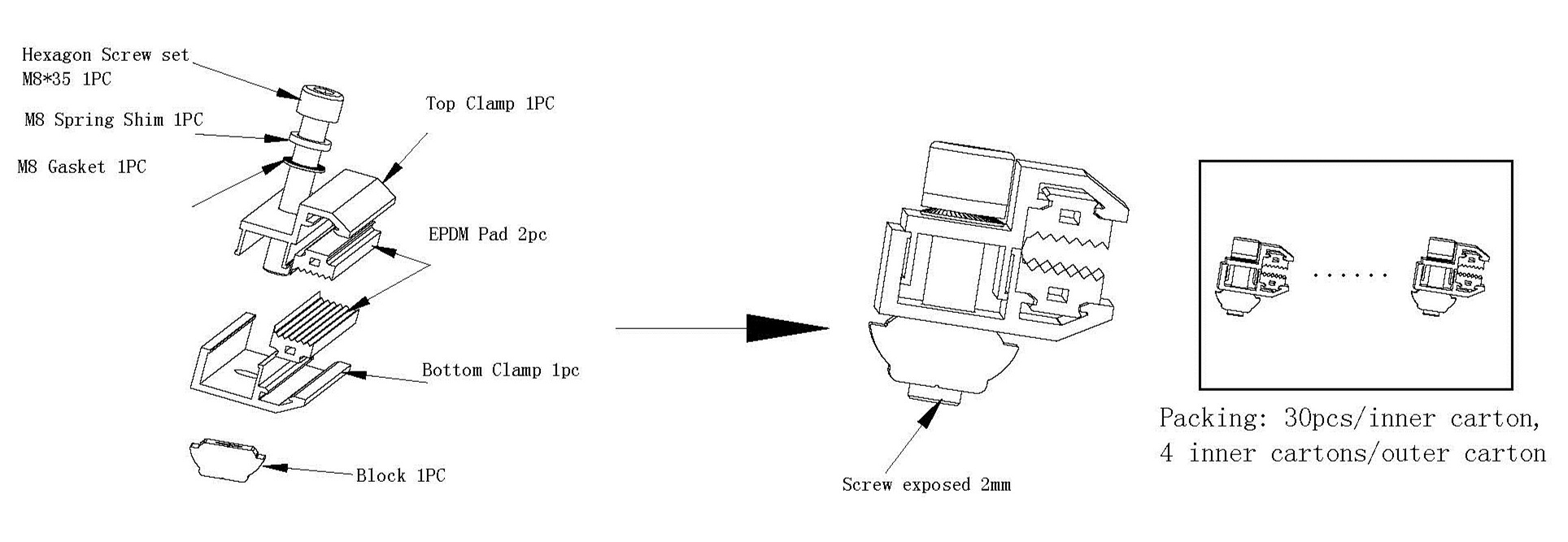 Die Dünnschicht-Endklemme für Sonnenkollektorbesteht aus Aluminium AL6005 - T5, kombiniert mit EPDM Pads, Befestigen Sie den rahmenlosen fest Panel auf Schienen. es ist praktikabel für die Dünnschichtplatten mit Dicke 6 - 10mm. Pre - montiert in der Fabrik welche Speichern Sie Ihre Installationszeit vor Ort und Kosten