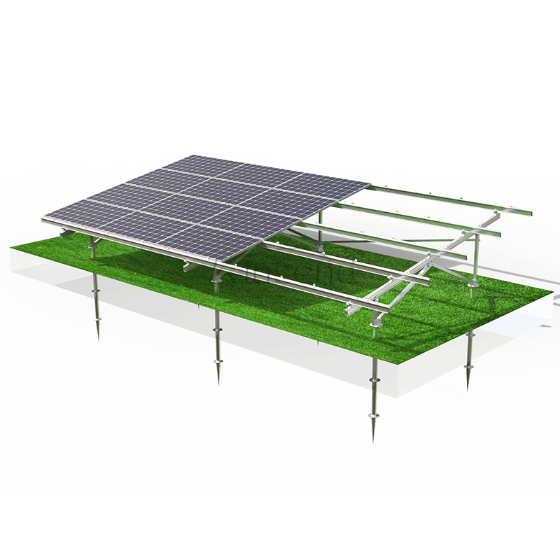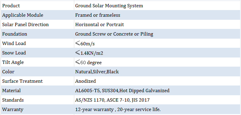 Das Solar-Bodenmontagesystem wird normalerweise auf ebenen Freiflächen eingesetzt. Die Hauptkomponenten werden in unserem Werk weitgehend vormontiert, was viel Zeit und Kosten für die Installation vor Ort spart. Die Komponenten sind auch bei kleinen Teilen vollseitig eloxiert, was einen großen Korrosionsschutz und eine lange Lebensdauer hat.