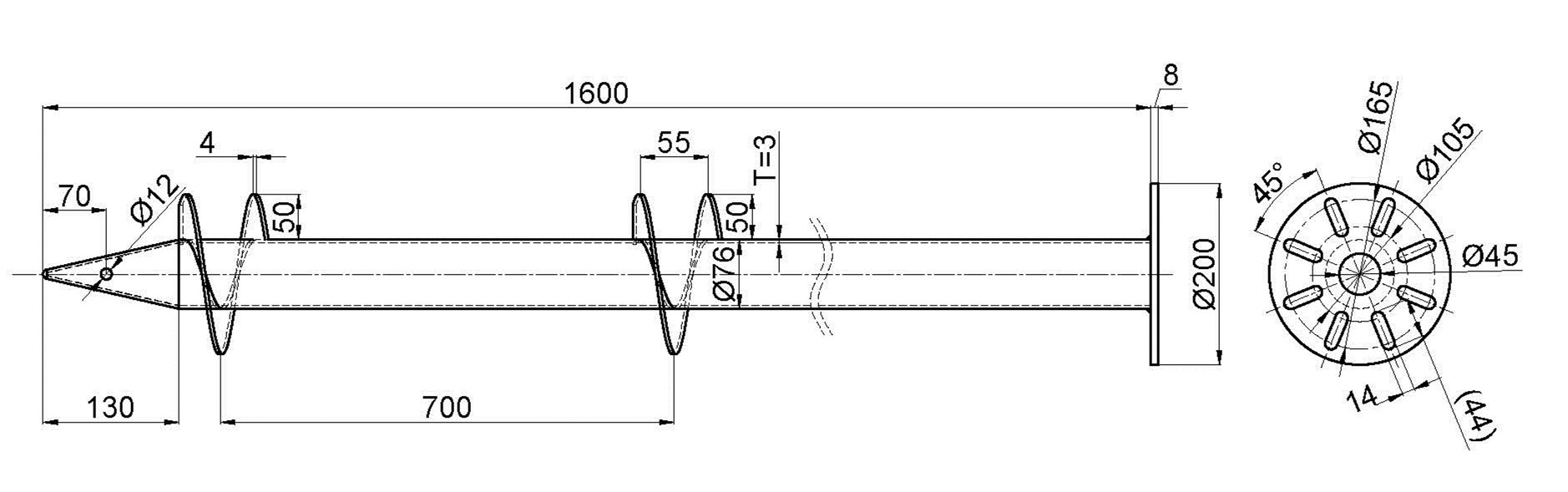 Produktname spiralförmige Erdungsschraube Mit Flansch Material Stahl Q235B Anti - ätzend Hot - dip Verzinken (DIN de ISO1461) Rohrdurchmesser 76mm Rohrdicke 3mm (2,5 mm / 3,5 mm / 3,75 mm / 4 mm / 5 mm) Flanschdurchmesser 200mm / 220mm Rohrlänge 1600mm (gemäß Kundenanforderung) Klingennummer 2 Klingen / 4 Klingen Farbe Silber- Garantie 10 Jahre Garantie