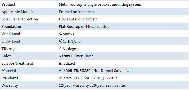 Das Metalldach-Dreieckshalterungssystem ist eine Art Montagesystem, das für Metalldächer entwickelt wurde. Dabei werden dreieckige Halterungen verwendet, die mit Schrauben oder anderen Befestigungsmitteln am Metalldach befestigt werden. Anschließend werden die Solarmodule an den Halterungen befestigt, wodurch ein sicheres und stabiles Fundament für die Solarmodule entsteht. Das Triangle-Dachmontagesystem ist eine effektive und effiziente Lösung für Solarmodulinstallationen auf Metalldächern, die Stabilität und Sicherheit erfordern, ohne dass eine Dachdurchdringung erforderlich ist.